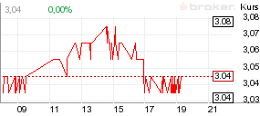 |  | ERÖFFNUNGSKURS |  | 3,04 EUR |  |  | JAHRESHOCH SEIT 1.1. |  | 3,40 EUR |  | ||||||||