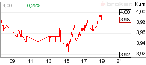 | KURS VORTAG | 4,06 EUR | JAHRESTIEF 250 TAGE | 3,64 EUR | ||||||||||||||